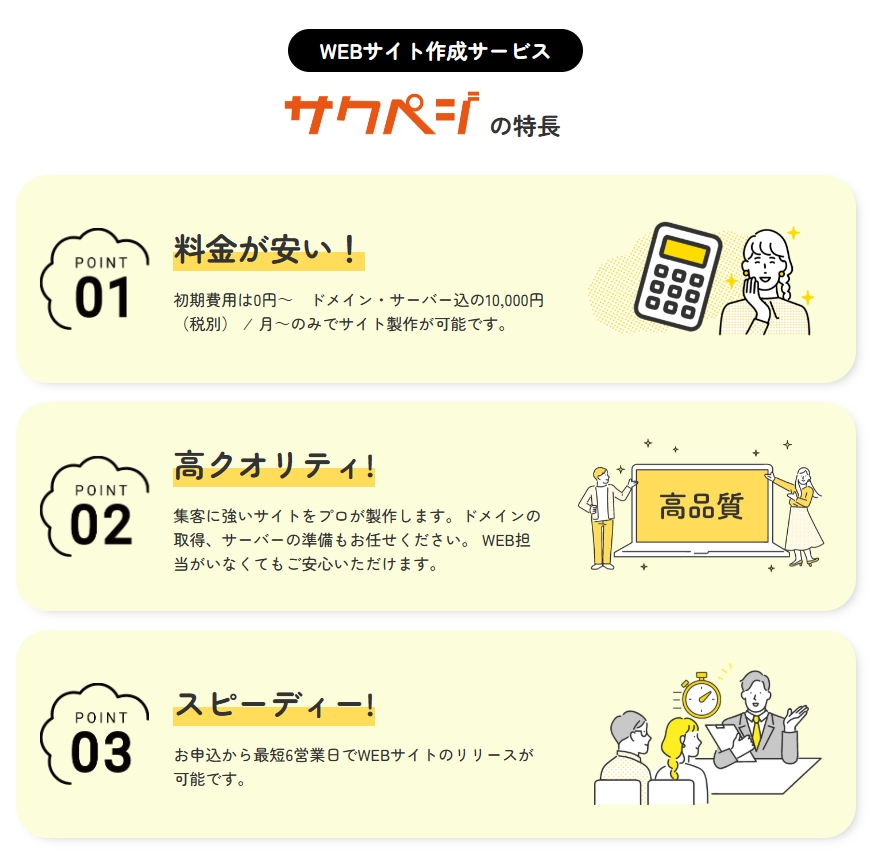 従来の一括見積り・高額請求型の制作会社と違い、「リスク少なくサイトを持ちたい」層に特化しているのが最大の特徴です。